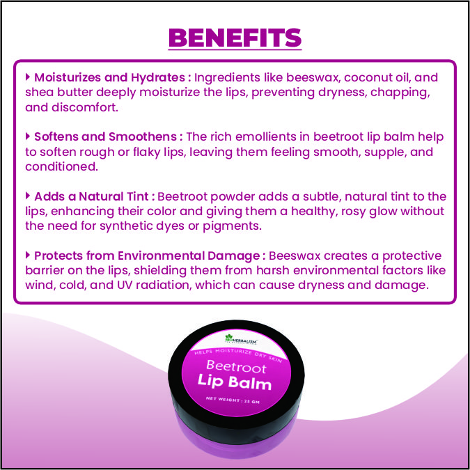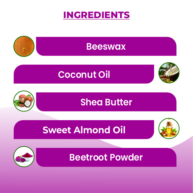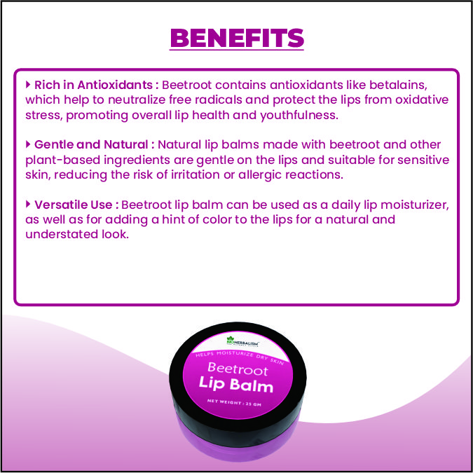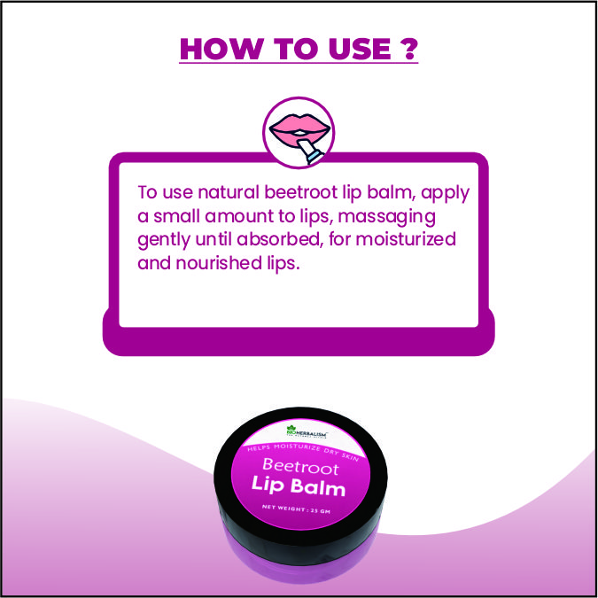 - Versatile Use: Beetroot lip balm can be used as a daily lip moisturizer, as well as for adding a hint of color to the lips for a natural and understated look.