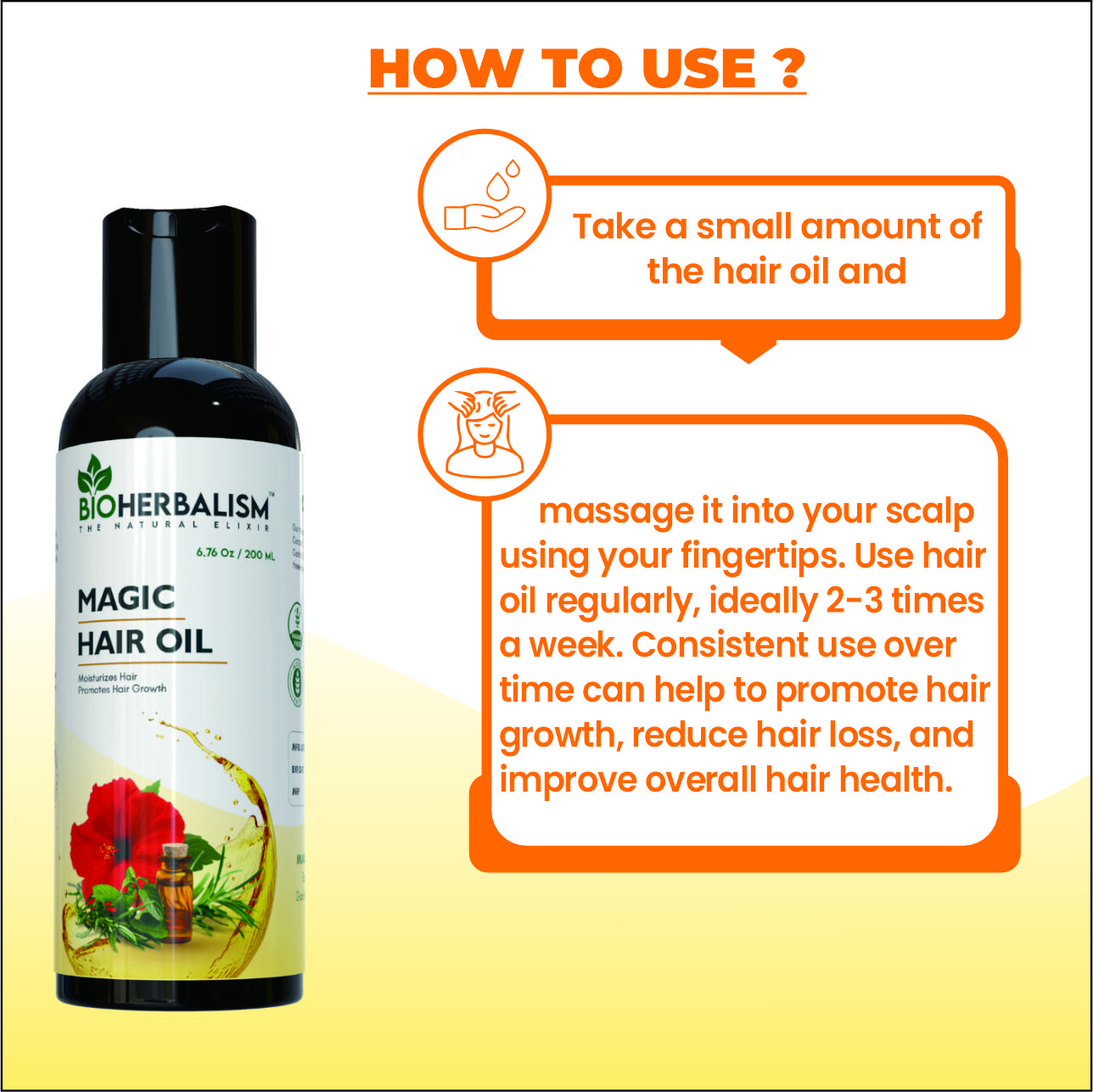 Take a small amount of the hair oil and massage it into your scalp using your fingertips. Use hair oil regularly, ideally 2-3 times a week. Consistent use over time can help to promote hair growth, reduce hair loss, and improve overall hair health.