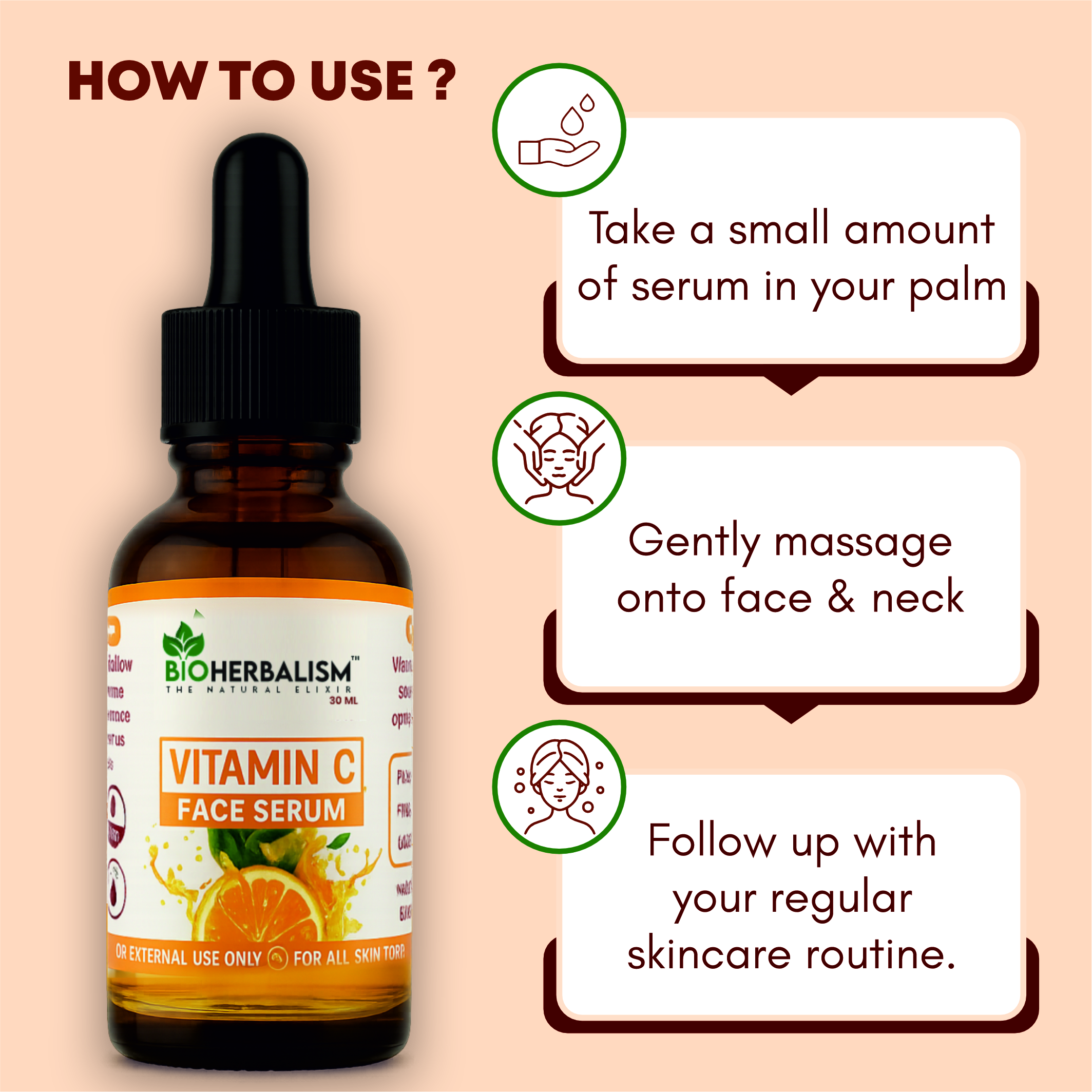 To use a natural vitamin C face serum, cleanse skin, apply a few drops onto fingertips, gently massage onto face and neck, then follow with moisturizer for a radiant complexion.